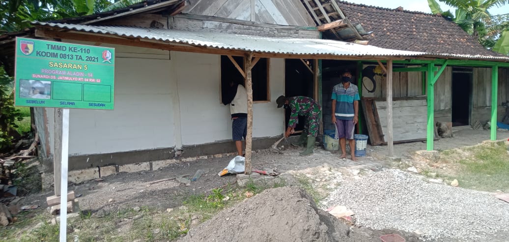 Bojonegoro – Satuan Tugas (Satgas) TMMD (TNI Manunggal Membangun Desa) ke 110 Kodim 0813/Bojonegoro Menggarap atau membangun RTLH (Rumah Tidak Layak Huni) dengan program Aladin (Atap Lantai dan Dinding) milik Sunardi warga RT 4 RW 2 desa Jatimulyo, Kecamatan Tambakrejo, Kabupaten Bojonegoro.