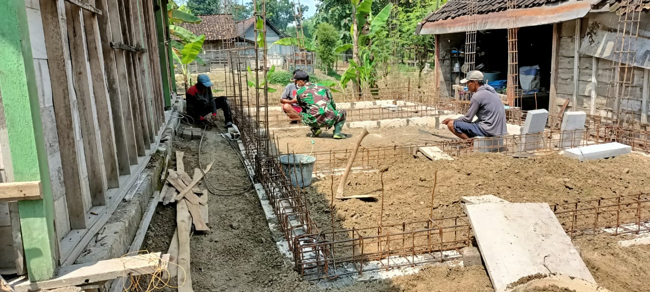 Bojonegoro – Anggota Satgas TMMD ke-110 Kodim 0813/Bojonegoro Kopda Adi membantu membuat slup dasar pondasi di rumah Ibu Pamintaningsih (45) warga RT 01 RW 01, Desa Jatimulyo, Kecamatan Tambakrejo, Jum’at (19/3/2021).