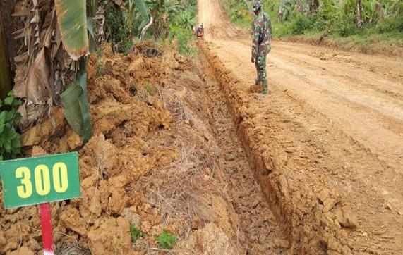 Karena dihadapkan dengan kondisi di wilayah ini sering terjadi hujan lebat dan membuat jalan air sering menggenang di tengah jalan, nah maka dari itu kami buatkan juga drainasenya. Ujar Serka Syahrul