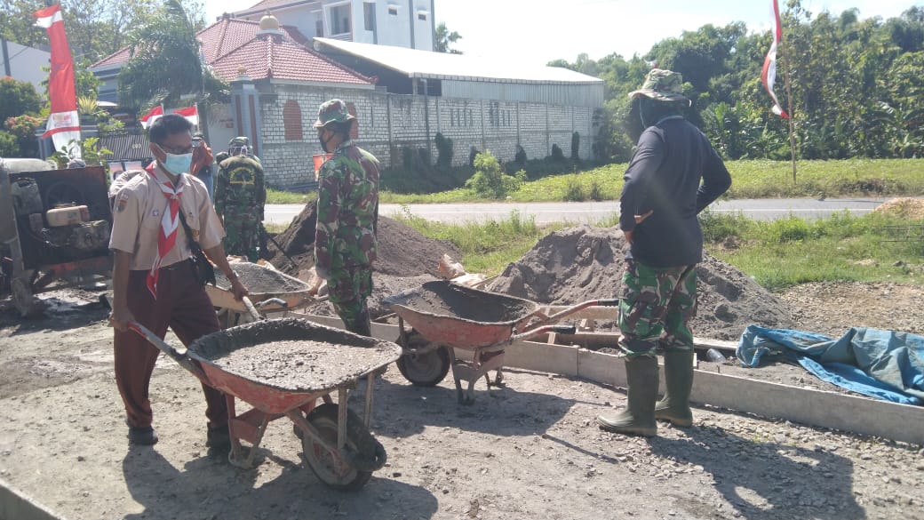 Pati – Pramuka Koorcab Pati mulai terjun ke lokasi pengecoran jalan TMMD Reguler 111 Kodim 0718/ Pati, di hari ke-23, di Desa Tamansari,Kecamatan Jaken, Kabupaten Pati, Jawa Tengah, Tampak mereka tidak membutuhkan waktu lama untuk menyesuaikan langsir adukan cor jalan dengan mengunakan Angkong.