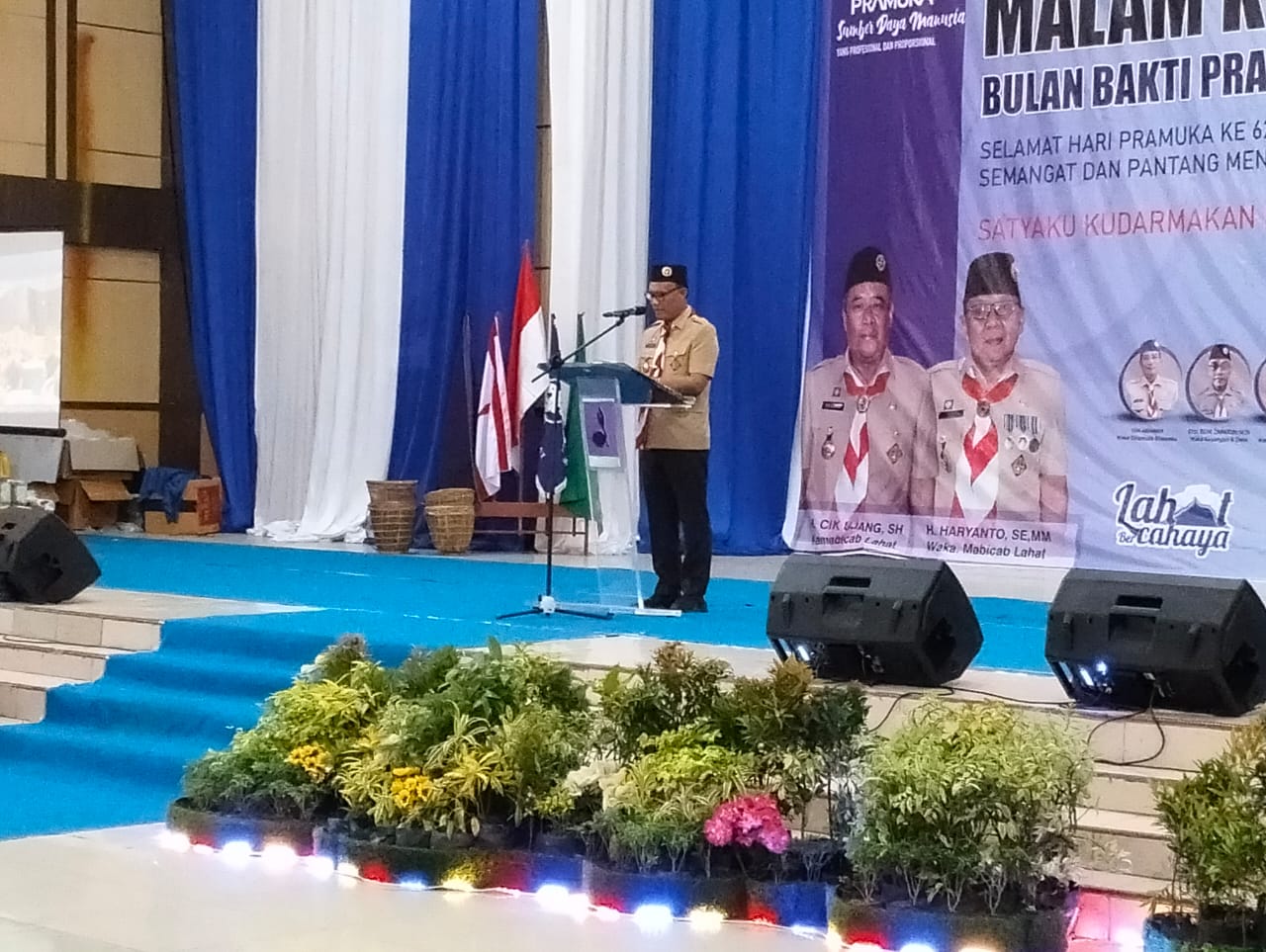 Kwarcab Lahat Fitrizal Homizi ST MSi pada sambutannya mengatakan, bahwa pramuka menjadi salah satu sejarah penting dalam kemerdekaan RI 1945, oleh karena itu pramuka tetap mampu mengimplementasikan dirinya yang dimakan zaman. ”Yang telah berpartisipasi atas terselenggaranya HUT Pramuka ke 62 tahun, saya yakin selain malam ini, salah satunya Kwarcab Lahat mengikuti Raimuna Nasional. Kontribusi ini didukung oleh semua unsur Pramuka, seperti kita ketahui tema pramuka ini menjadikan SDM yang profesional, semangat cinta tanah air dan bela Negara. Tahun ini kita bertepatan dengan 5ahun politik Pramuka harus tegak lurus gidak berpihak dengan parpol manapun. Kwarcab Kabupaten Lahat vaik Siaga, Penegak dan Penggalang dapat kita Aplus Ok,” jelasnya.