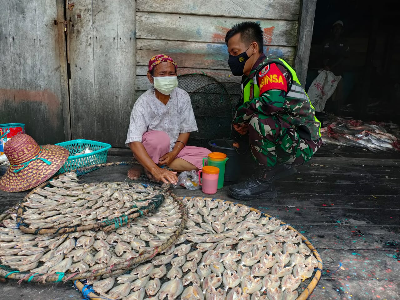 Di sela-sela tugasnya sebagai anggota Satgas, Serma Syahrul yang menyempatkan diri untuk komunikasi sekedar ngobrol di lokasi TMMD bersama ibu-ibu warga Desa Manunggul yang sedang bekerja menjemur ikan.