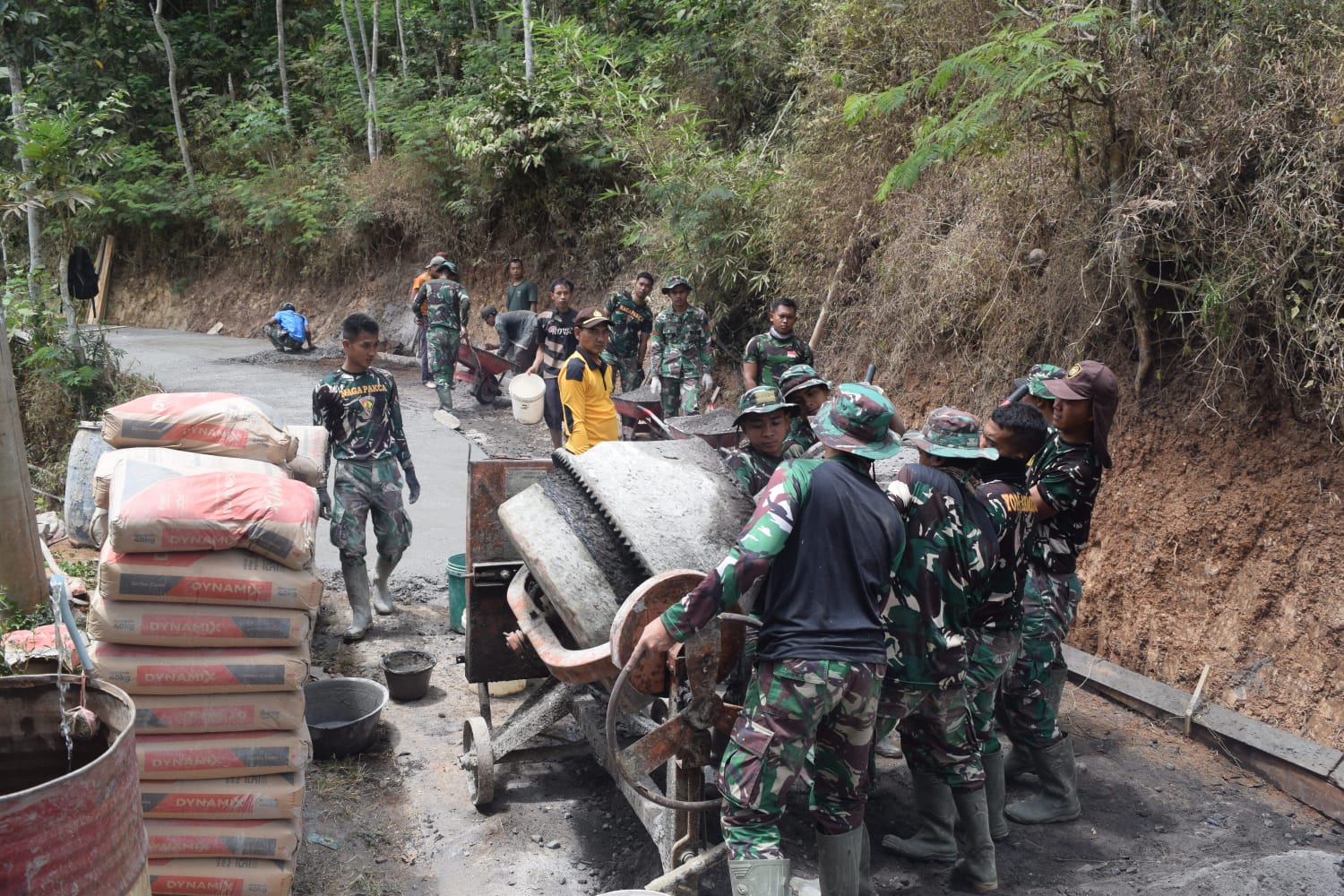 Dalam pembangunan jalan rabat beton, SSK Satgas TMMD yang dipimpin langsung Oleh Komandan SSK Letda Arm Sucipto memanfaatkan mesin pengaduk beton (Molen Beton) untuk mempercepat pekerjaan.