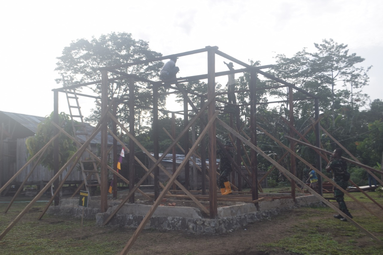 Sorong, Papua Barat – Sejak resmi di buka program TMMD Ke -110 Oleh Bapak Bupati Kab Sorong dan dipeletakan batu pertama. Pemilik Rumah Bapak Pamenas Urini di program TMMD Ke – 110 Kodim 1802/Sorong sudah mulai tahap kerangka rumah, Bertempat di Kampung Kamlin Distrik Wemak Kabupaten Sorong. Jumat(05/03/2021).