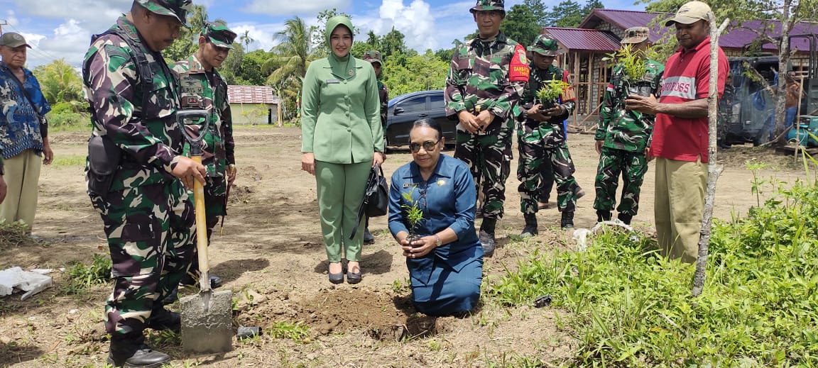 SARMI , – Masih dalam rangkaian Pembukaan TMMD 123 Kodim 0712/Sarmi, Dansatgas TMMD 123 Kodim 1712/Sarmi Letkol Czi Bagus Marsudi Joko Hartono yang Di dampingi staf ahli bidang kemasyarakatan dan SDM Kab Sarmi, ibu Femmy F.Y Krew ST. Dan danlanal Sarmi melaksanakan penanaman pohon pada lokasi pelaksanaan TMMD lebih kususnya pada depan halaman lokasi gedung gereja yg akan di bangun di kampung Pondena distrik Bonggo kab Sarmi, Rabu, 19/02/2025.
