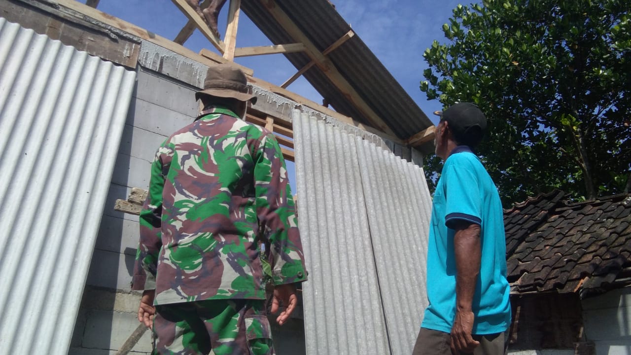 Serda Sutriyono mengatakan, pihaknya dan warga bekerja gotong-royong memasang atap di rumah Pamintaningsih RT.01 RW.01 Desa Jatimulyo, Kecamatan Tambakrejo, Kabupaten Bojonegoro,Rabu(24/03/2021).