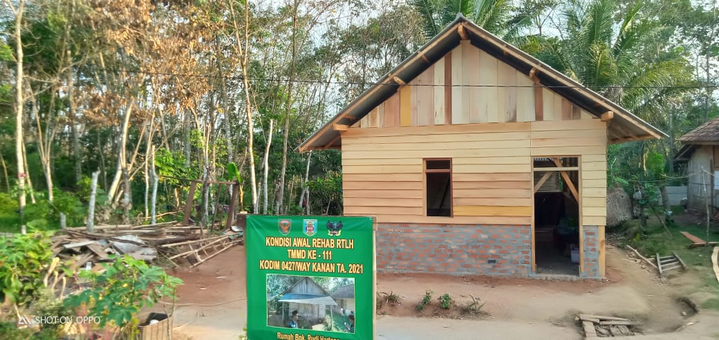 WAY KANAN – Pencapaian rehab rumah bapak Rudi Hartono oleh anggota Satgas Pra TMMD ke-10 di bantu Masyarakat di Dusun Muara Langka, Kampung Negeri Batin, Kecamatan Umpu Semenguk, Kabupaten Way Kanan, sudah mencapai 76%. Kamis (10/6/2021)