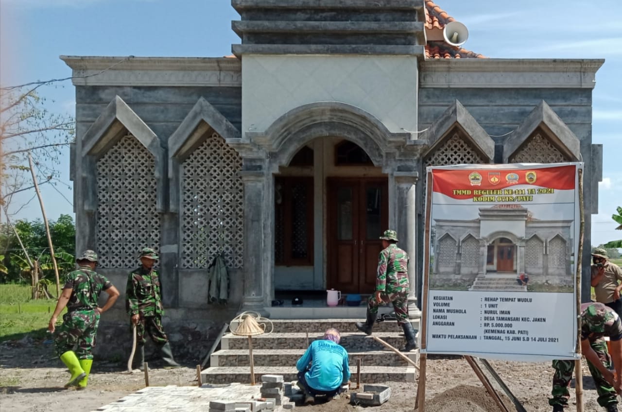 Pengerjaan renovasi Masjid yang sudah dilakukan satu minggu sejak dibukanya kegiatan program TMMD Reguler ke-111 Kodim Pati tanggal 15 Juni 2021 yang lalu, kini hasil pencapaian lebih kurang 70 persen.