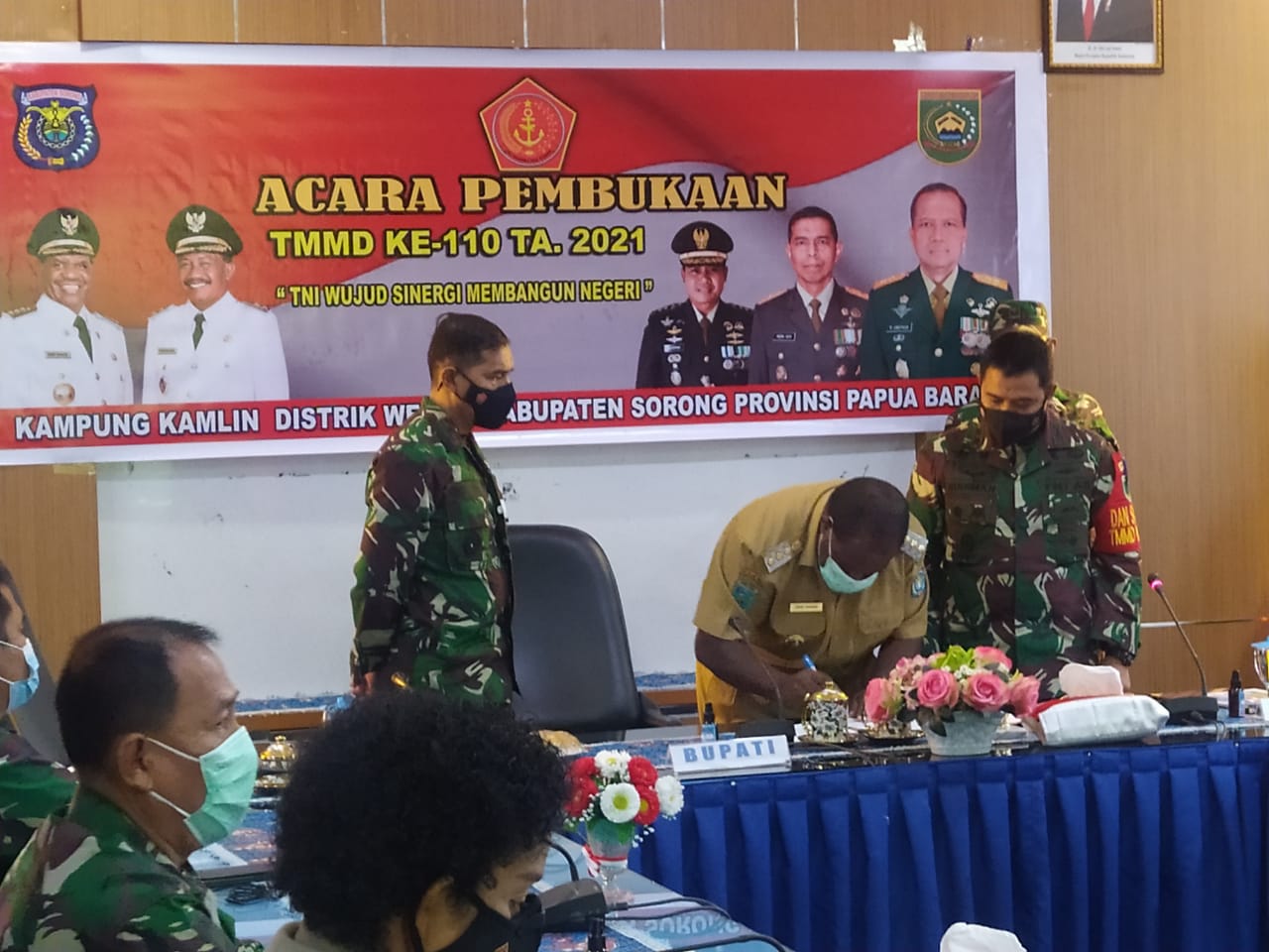 Sorong, Papua Barat – Pembukaan TNI Manunggal Membangun Desa (TMMD) Kodim 1802/Sorong ke-110 TA. 2021 dengan tema “TNI Wujud Sinergi Membangun Negeri “di selenggarakan di Ruang Pola Kantor Bupati Sorong, Jalan Sorong – Klamono Km 24, Kelurahan Klamasan, Distrik Mariat Kabupatn Sorong. Selasa (02/03/2021).