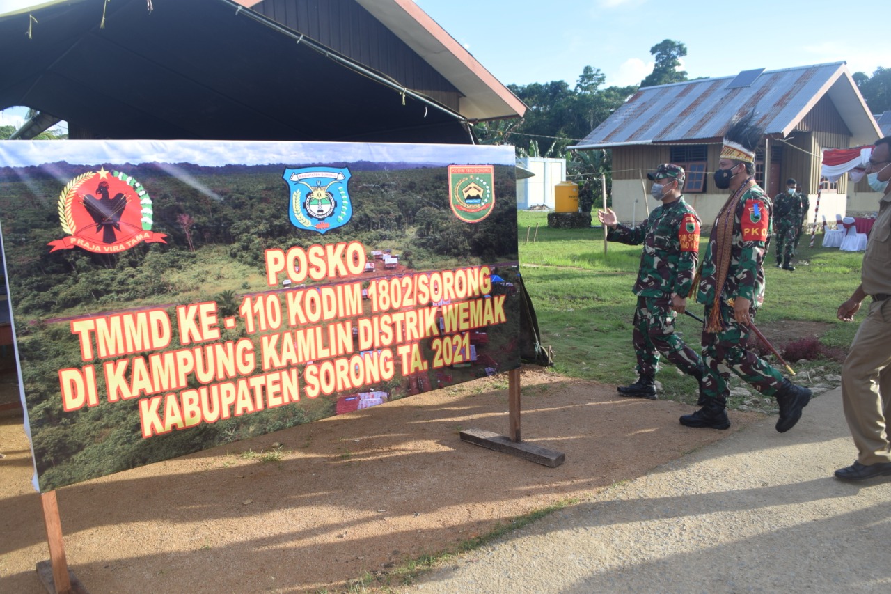 Sorong, Papua Barat – Selain kunjungan kerja Pangdam XVIII/Kasuari Mayjen TNI I Nyoman Cantiasa, SE, M.Tr ( Han ) mengecek langsung 8 unit rumah permanen tipe 42, Posko TMMD Ke-110 tak luput di kunjungi, bertempat di Kampung Kamlin Distrik Wemak Kabupaten Sorong.