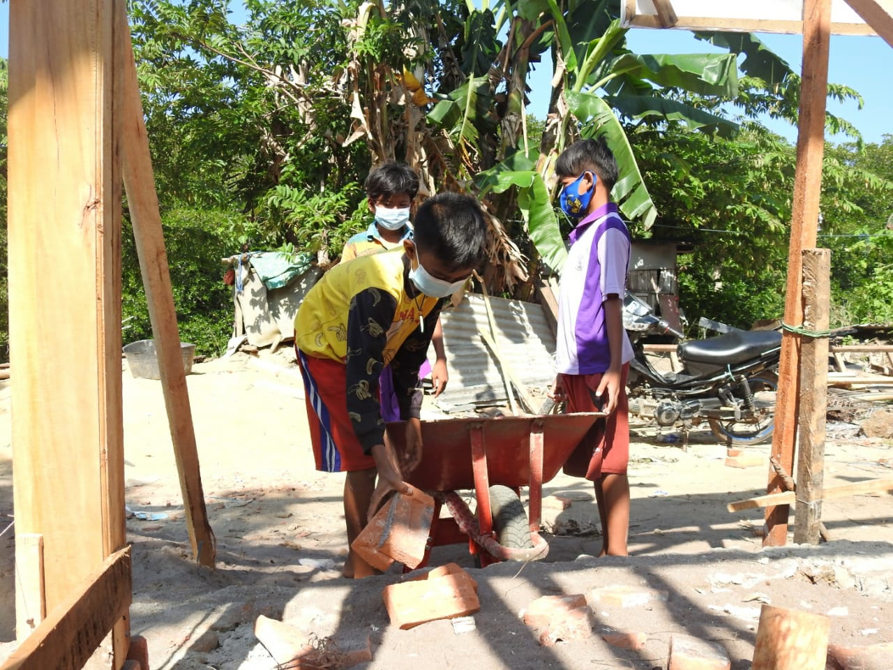 Pagi menjelang siang itu Sabtu (6/3/2021), tampak 4 Anak laki-laki yang turut membantu satgas TMMD melaksanakan pembangunan rumah milik bu Sainah.
