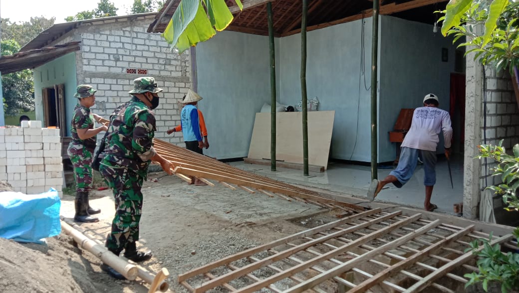 Dipimpin oleh Peltu Agung Suwidagdo, anggota satgas TMMD terlihat mulai proses pembongkaran yang dimulai dari atap rumah dan nantinya akan dilanjutkan pada tahap selanjutnya yakni pembangunan tembok rumah.