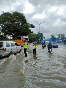 Para Personel Polsek Kalidoni bertahan mengatur lalu lintas di tengah banjir. Bahkan banyak juga yang membantu para pengendara terjebak banjir di seputaran Jalan depan PDAM Kalidoni Palembang.