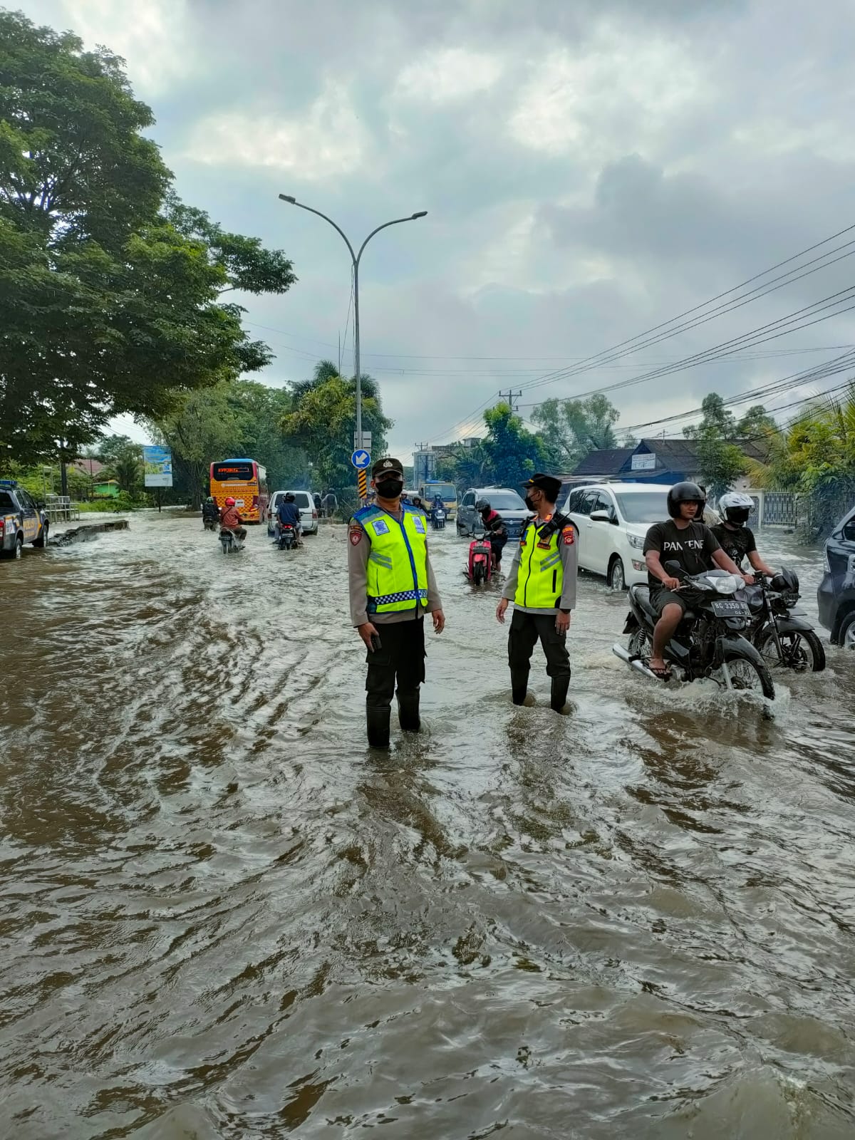 Para Personel Polsek Kalidoni bertahan mengatur lalu lintas di tengah banjir. Bahkan banyak juga yang membantu para pengendara terjebak banjir di seputaran Jalan depan PDAM Kalidoni Palembang.