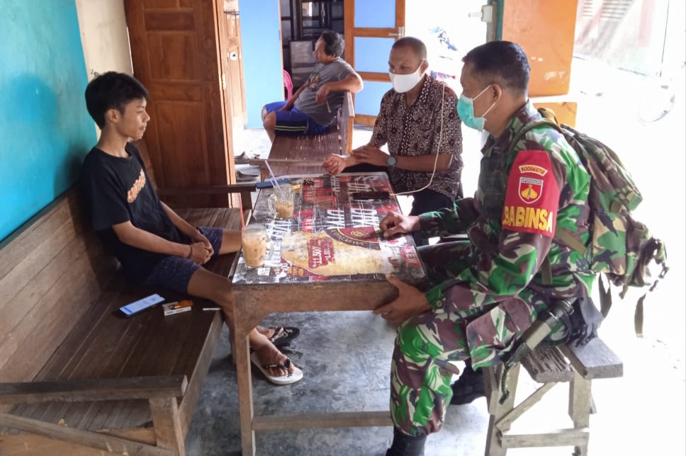 Seperti terlihat saat ini, Sertu Jumroni bersama Perangkat desa sedang memberikan edukasi dan sosialisasi kepada seorang remaja yang sedang nongkrong di bangku sebuah warung, terkait kepatuhan terhadap prokes ketika berada di luar rumah ataupun saat melakukan kegiatan, Sabtu (10/7/2021).
