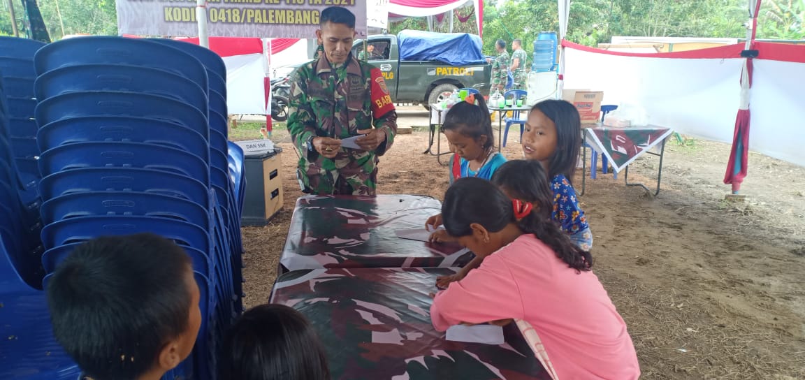 Palembang,KODIM0418-disela sela tugas satgas TMMD di kampung Jawi yang begitu padat, namun satgas tak sungkan mengajak anak anak kampung Jawi bermain seni melipat kertas atau origami ketika waktu jam istirahat kerja.