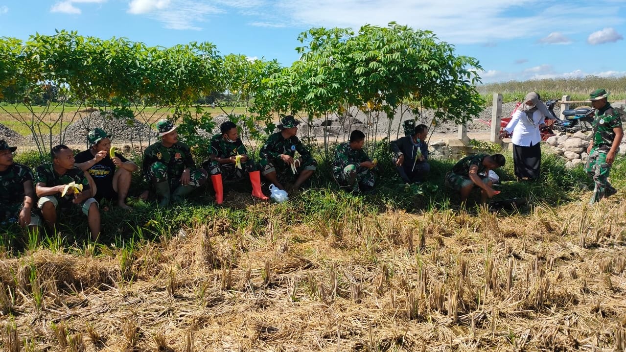 Disela istirahat sejenak sambil melepaskan lelah, satgas TMMD mendapatkan dukungan snack yang diantar oleh Bu Bayan sehingga menambah semangat mereka dalam bekerja. Sambil bersenda gurau dan saling cerita mereka menikmati makanan yang disajikan.