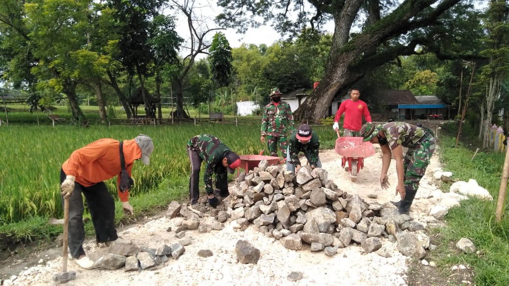 Bojonegoro-Anggota Satgas TMMD ke-110 Kodim 0813/Bojonegoro bersama warga Dusun Kramanan, Desa Jatimulyo, Kecamatan Tambakrejo, bergotong-royong menata dan merapikan material batu di jalan yang akan bangun atau diperbaiki melalui program fisik TMMD ke-110 Kodm 0813/Bojonegoro.
