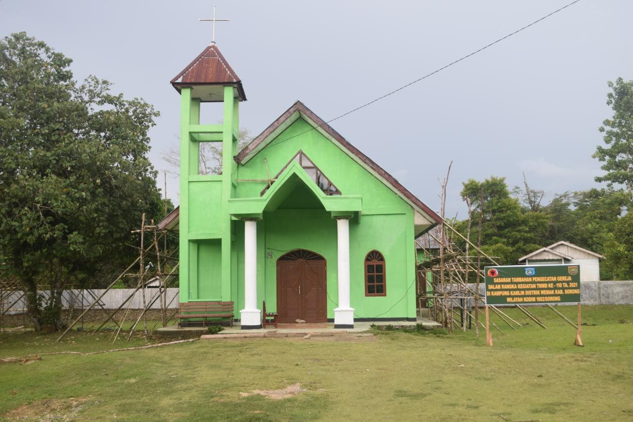Sorong, Papua Barat – Dua pekan berlalu sasaran tambahan Program TMMD Ke-110 Kodim 1802/Sorong pengecatan gereja GKI Syaloom sudah capai 50 persen bertempat di Kampung Kamlin Distrik Wemak Kabupaten Sorong.