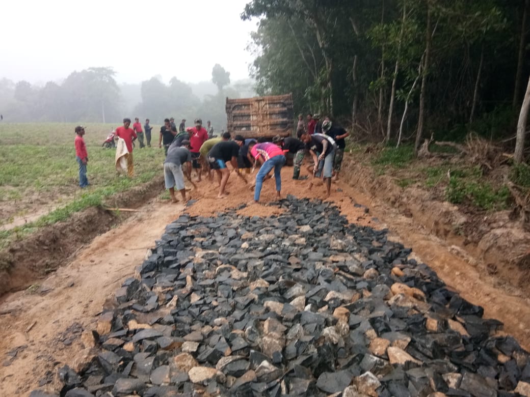 Pembangunan jalan Desa ini sudah 26 Hari Berjalan bersama masyarakat, terlihat jelas antusias masyarakat bersama satgas TMMD pun terus terjalin terutama dlalam meratakan Pasir yang diturunkan Dari Dam Truck.