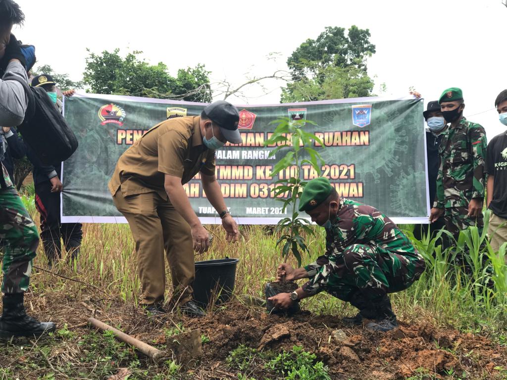 Mentawai – Kegiatan TMMD ke-110 di wilayah Kodim 0319/Mentawai diadakan penanaman bibit buah Mangga, Durian Rambutan, dan Matoa, yang diperoleh dari bantuan Dinas Pertanian sebanyak 50 bibit Berkualitas kepada masyarakat Kab.Kep Mentawai.