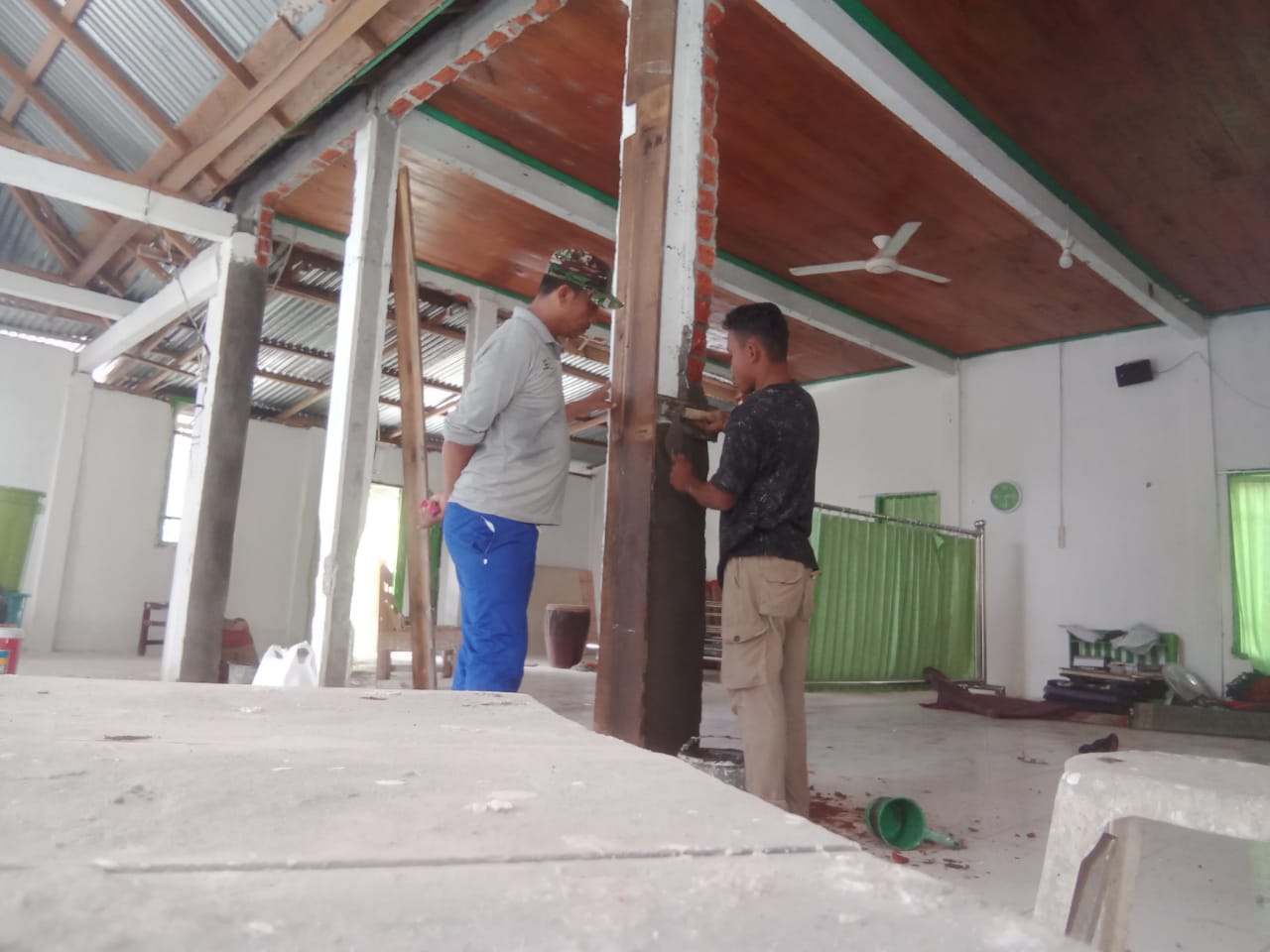 EMPAT LAWANG – Personial Satgas TMMD ke 122 Kodim 0405/Lahat terus bergerak, kali ini sasaran mereka memplester tiang-tiang Mushola Syiar Islam, di Desa Lampar Baru, Kecamatan Talang Padang, Kabupaten Empat Lawang.