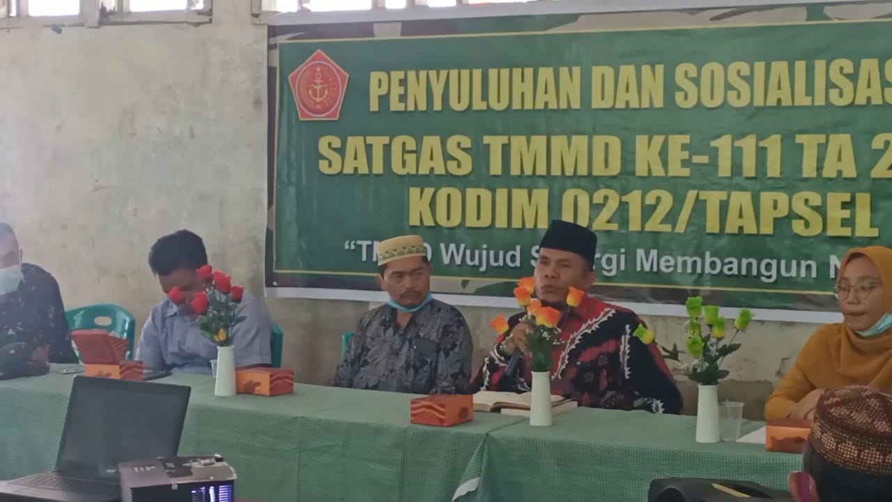 Satgas TMMD ke 111 Kodim 0212/TS berlokasi di lokasi Penyuluhan Agama di Kantor Desa Siuhom, Kec. Angkola Barat, Kab. Tapanuli Selatan,Kementerian Agama Kota Padang Sidempuan, Muhammad Nuh Hsb, S.Sos, Minggu (27/6/2021) mengatakan Satgas selengarakan program non fisik penyuluhan agama di TMMD Kodim Tapsel. (*)