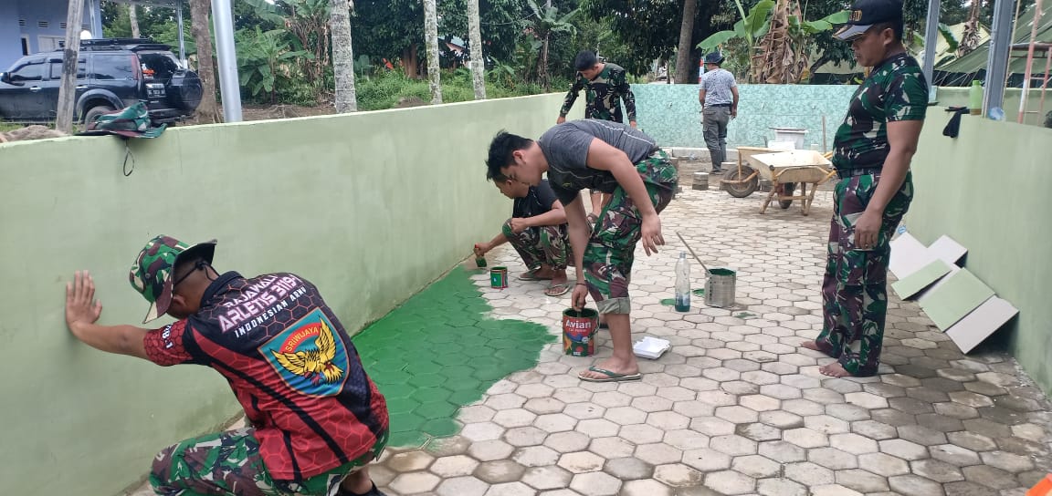 Dengan bergotong royong, Satgas dibantu masyarakat sekitar bahu membahu melakukan pengecatan batu kaping blok yang sudah terpasang di halaman masjid Nurul Iman. Pengecatan yang dilakukan ini, agar mempercepat penyelesaian pengerjaan kaping blok di halaman masjid Nurul Iman.