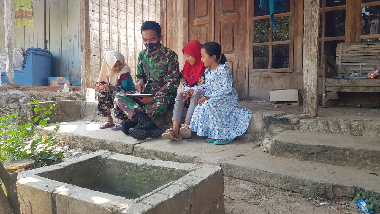 Serda Sukarji salah satu anggota satgas pra TMMD tampak sedang mengarahkan anak-anak belajar menggambar dan membaca, disisipkan pula dengan memberikan wawasan kebangsaan dan edukasi tentang pentingnya penerapan protokol kesehatan dimasa pandemi, Selasa (08/06/2021).