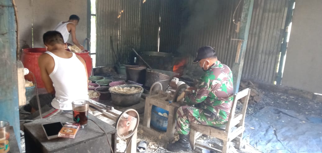 BOJONEGORO – Guna Jalin Silaturrahmi, Satgas TMMD ke-110 Kodim 0813/Bojonegoro melakukan komunikasi Sosial (Komsos) dengan pengusaha kripik singkong. Senin (22/3/2021).