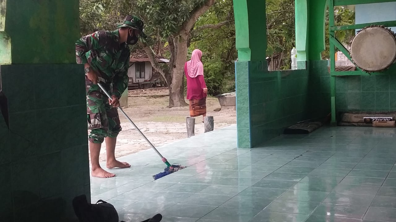 Sebagai wujud kepedulian Anggota Satgas TMMD 110 Kodim 0813/Bojonegoro, Kopda Adi membantu membersihkan masjid untuk persiapan sholat berjamaah, Kamis (04/03/2021).