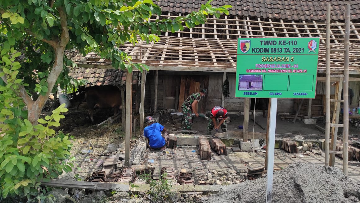 Satgas TMMD 110 Kodim 0813/ Bojonegoro mulai membongkar rumah warga bernama Samadun di Ngerancang Rt.03 Rw.01 yang mendapatkan rehap rumah dalam program fisik TMMD ke-110 di Desanya, Kamis(4/3/2021).