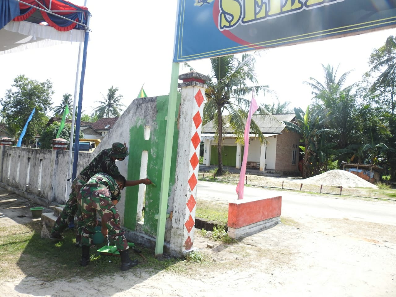 Lampung Timur, Agar terlihat lebih bagus, asri dan menarik pagar balai desa Sukorahayu, Labuhan Maringgai, di cat oleh Anggota Satgas TNI Manunggal Membangun Desa (TMMD) Ke- 110 Kodim 0429/Lamtim.
