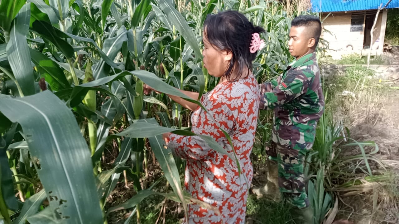 Bengkayang – Terjun langsung ke kebun, Satgas TNI Manunggal Membangun Desa (TMMD) ke 111 Kodim 1202/Skw bantu warga panen jagung.