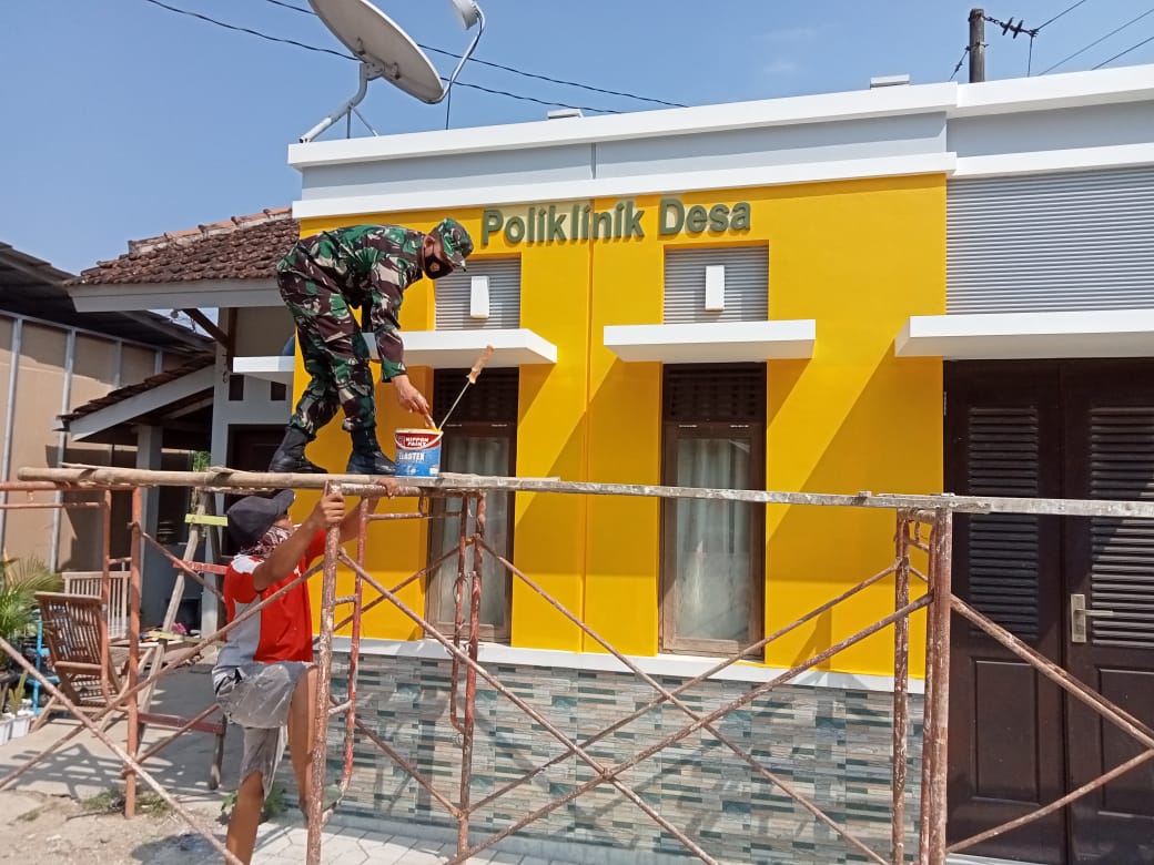 Kopda Harri personel satgas TMMD ini tidak sendiri. Ia juga ditemani Endri (34) salah satu petugas kantor desa saat melakukan pengecatan bagian depan poliklinik desa.