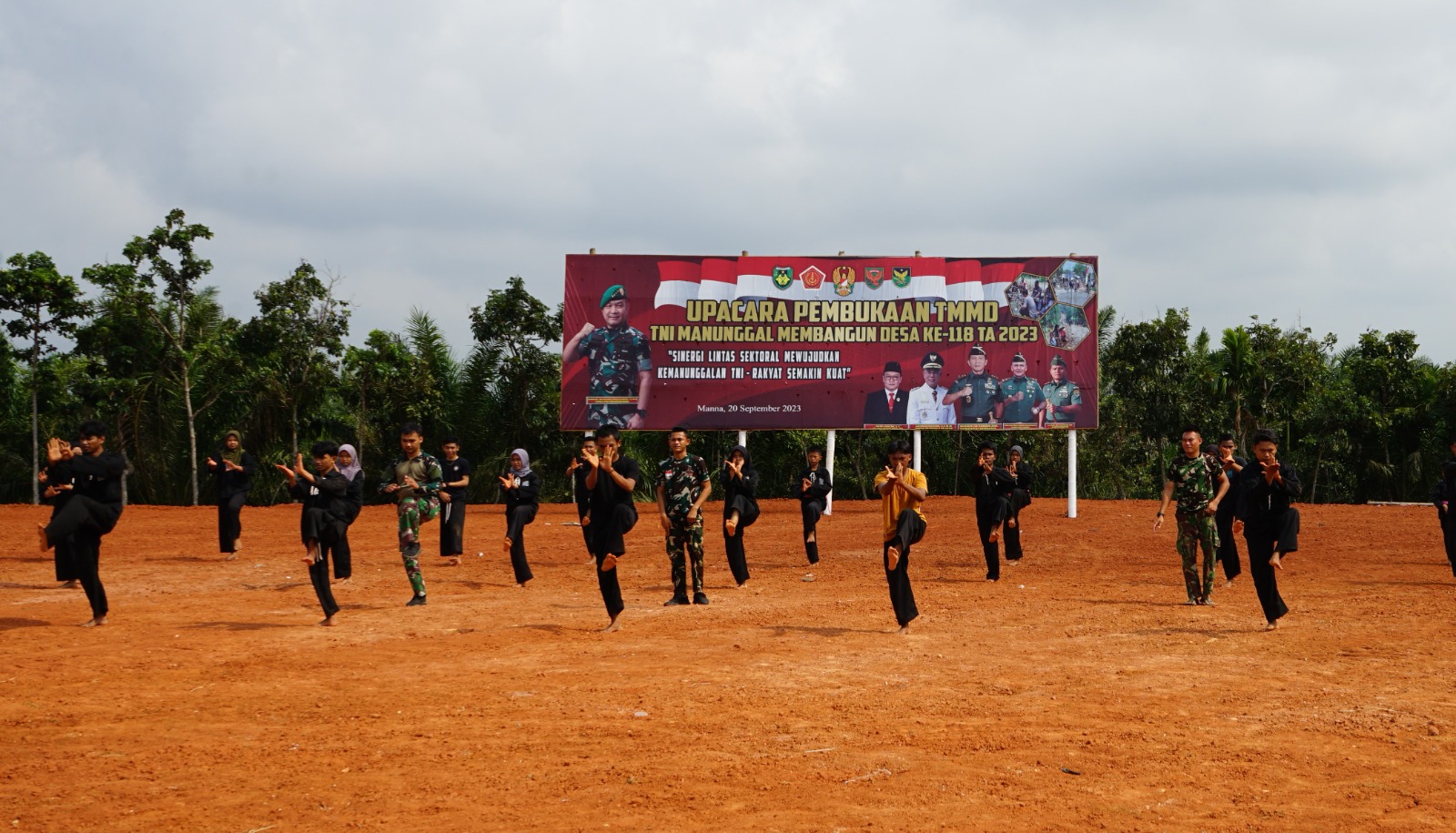 Kambang Ayun – Selain pembangunan beberapa infrastruktur di wilayah Desa Kembang Ayun Kec. Manna Kab. Bengkulu Selatan dan kegiatan nonfisik lainya dalam kegiatan TNI Manunggal Membangun Desa (TMMD) ke-118 Kodim 0408/BS, Satgas TMMD juga melaksanakan kegiatan lainya guna terjalin komunkasi serta hubungan yang erat dari berbagai kalangan anggota Satgas TMMD, turut serta dalam rangkaian Kegiatan TMMD dengan mengikuti seni beladiri pencak silat di Desa Kembang Ayun, Minggu (10/15/2023).