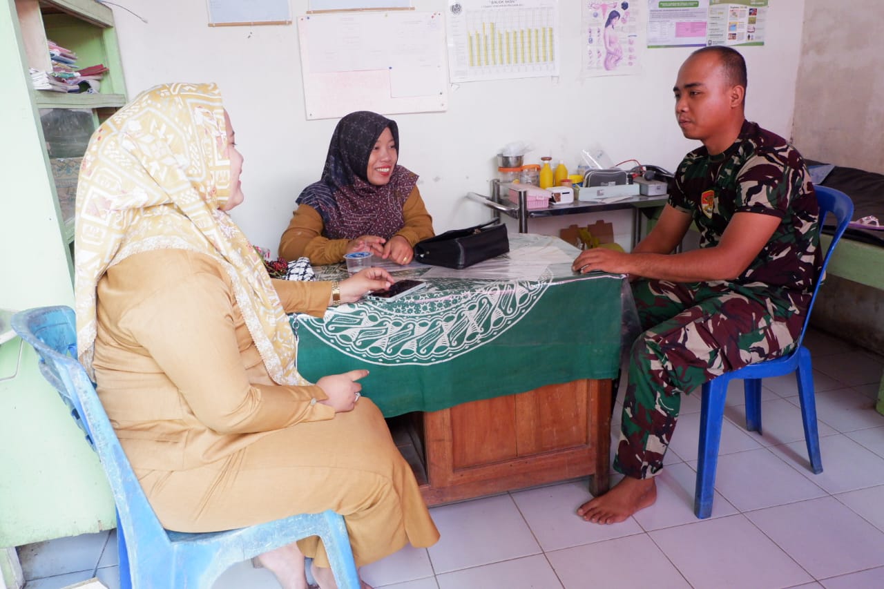 Anggota satgas TMMD ke 117 Kodim 0403/OKU Pratu Feri Irawan mengadakan komunikasi sosial (komsos) bersama Bidan Puskesmas Pembantu Desa, ibu Zelvia dan ibu Rita yang bertugas di Desa Karang Endah, Kecamatan Lengkiti, Kabupaten OKU, Senin (07/08/2023)
