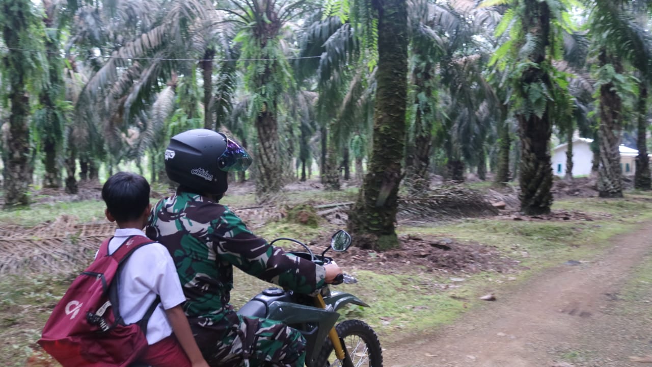 Kepedulian terhadap dunia pendidikan membuat anggota satgas TMMD Ke -117 Kodim 0416/Bute rela membagi waktunya untuk mengantar anak-anak ke sekolah.