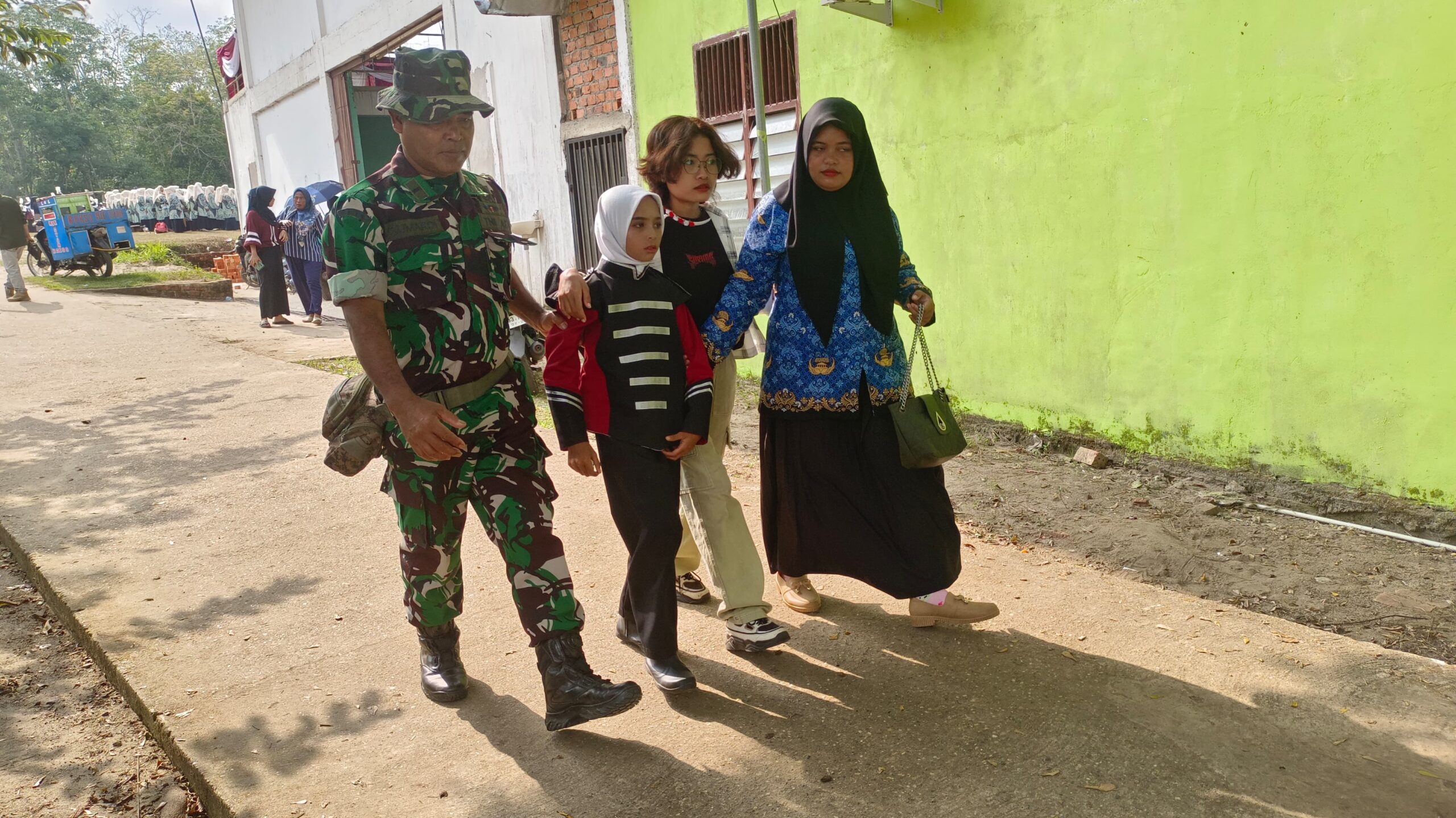 JAMBI – Satgas TMMD ke 121 Kodim 0415/Jambi membantu siswi SDN di Desa Maju yang kelelahan saat melaksanakan upacara HUT RI ke 79.
