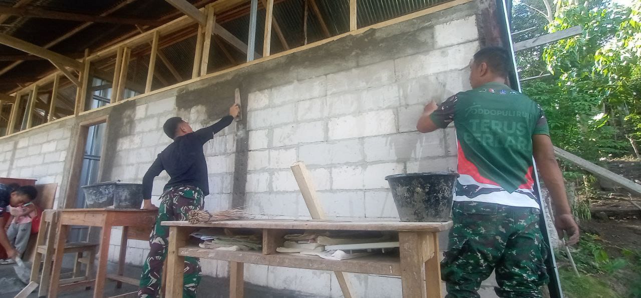 Bone – Wujud kepedulian, Satgas TMMD 122 Kodim 1407/Bone melaksanakan plesteran dinding kelas Sekolah yang berlokasi di dusun Bompo, Desa Mamminasae, Kec. Lamuru, Kab. Bone. Senin (21/10/2024).