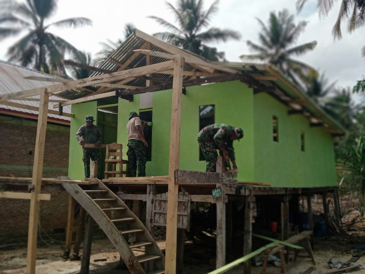 Untuk saat ini, pengerjaannya sudah ke tahap pengecatan rumah bagian depan dan bagian atap teras rumah,”terlihat anggota satgas TMMD Ke-122 begitu bersemangat dalam kegiatan tanpa mengenal lelah.
