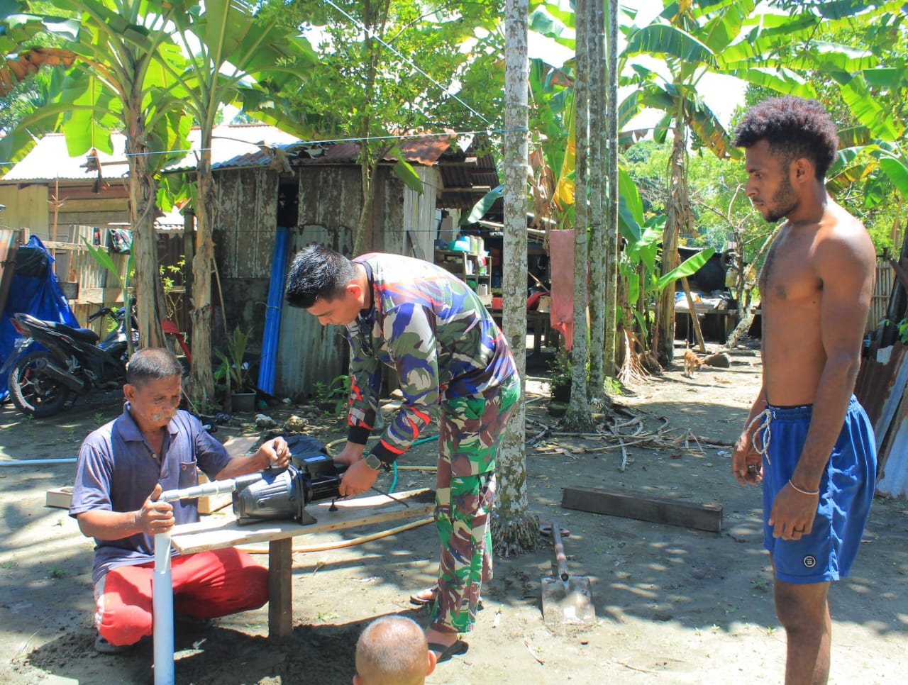 SARMI – Satuan penugasan TNI Manunggal Membangun Desa (TMMD) ke-123 Kodim 1712/Sarmi bersama warga di Kampung Podena, Distrik Bonggo, Kabupaten Sarmi, Papua terus gencarkan pengerjaan fasilitas sumber air bersih dengan memasang pompa air di 5 titik sumur bor. Jumat (14/3/2025).