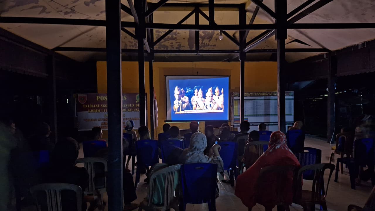 Konawe – Satgas TMMD ke 125 Kodim 1417/Kendari menggelar kegiatan Nonton Bareng (Nobar) film perjuangan yang disaksikan langsung oleh masyarakat Kecamatan Asinua, Kabupaten Konawe, Rabu (20/8).