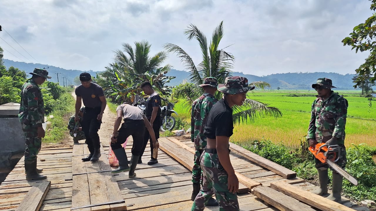 Konawe – Anggota TNI dan Polri yang tergabung dalam Satgas TMMD (TNI Manunggal Membangun Desa) 125 Kodim 1417/Kendari sedang melakukan pemasangan papan roda pada jembatan, di Desa Awua Jaya, Kec. Asinua, Kab. Konawe, Selasa (29/7).