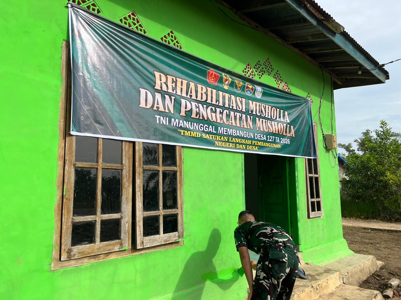 BANYUASIN – Anggota Satuan Tugas (Satgas) TNI Manunggal Membangun Desa (TMMD) ke-127 Kodim 0430/Banyuasin (BA) terus memacu pengerjaan rehabilitasi dan pengecatan Mushola Nurul Iman yang terletak di Jalur 12, Desa Wonosari, Kecamatan Pulau Rimau. Hingga saat ini, progres pekerjaan telah mencapai 75 persen.