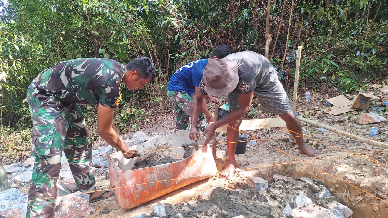Meski harus menghadapi tantangan medan yang cukup terjal dan berat, antusiasme anggota Satgas dan masyarakat tidak luntur dalam mengangkut material batu serta campuran semen ke lokasi pembangunan.