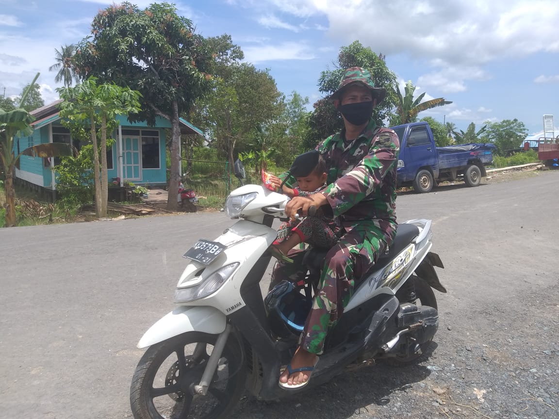 Kapuas,- Untuk terus menjalin kedekatan terhadap rakyatnya di lokasi TMMD, anggota Satgas TMMD ke-110, Kodim 1011/KLK, Serda Satria dengan menggunakan kenderaan roda dua berangkat bersama anak Desa Saka Lagun untuk membelikan jajanan, Minggu (21/3/2021).