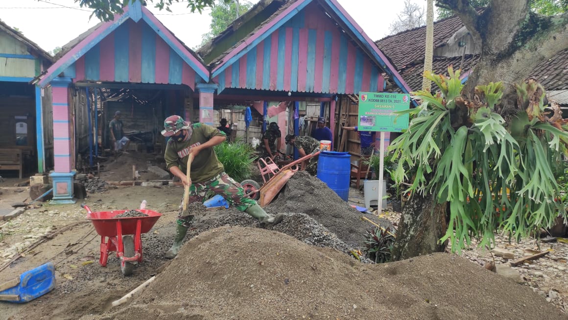 Bojonegoro – Para Personil TMMD ke-110 yang melaksanakan pengerjaan rumah milik Pasir warga yang masuk kategori RTLH (rumah tidak layak huni) desa Ngrancang, Kecamatan Tambakrejo, Kabupaten Bojonegoro, dengan program Aladin (atap lantai dan dinding) program TMMD ke-110 kodim 0813/Bojonegoro berjibaku tak henti untuk dilakukan pembangunan hingga selesai.