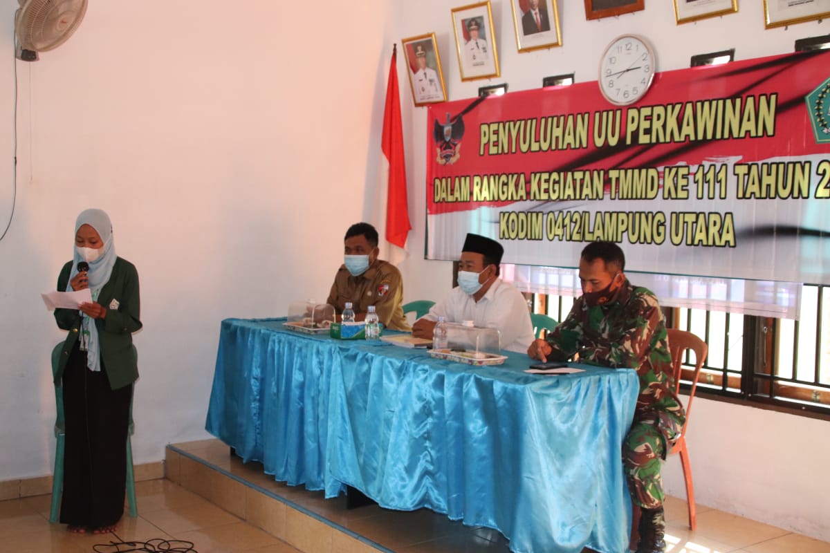 Kegiatan ini, Satgas TMMD melibatkan Kepala Kantor Urusan Agama Kecamatan Abung Selatan, Andi Komarhadi S.ag selaku pembawa materi sosialisasi Undang Undang Pernikahan.