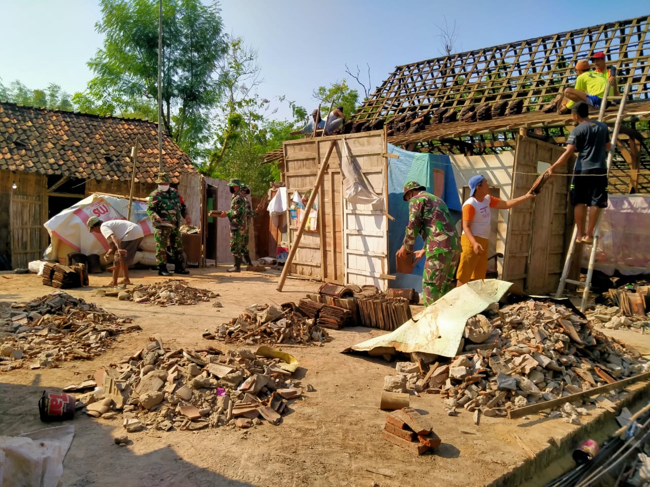 Serma Ariyanto bersama Satgas dan warga bekerja gotong-royong di rumah milik SafariĀ (54) RT 01 RW 02 Dusun Pandahan Desa Tamansari Kecamatan Jaken untuk melakukan pembongkaran rumah yang akan segera direhab.